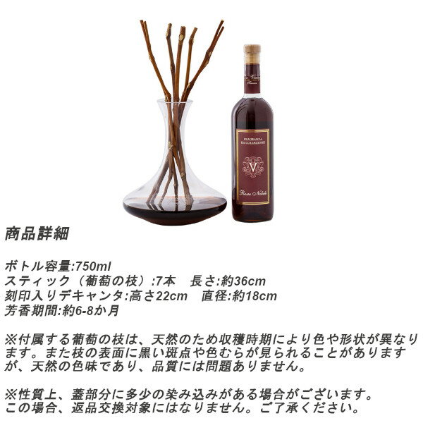商品名 Dr.Vranjes ドットール・ヴラニエス ロッソ・ノービレ ROSSO NOBILE 750ml SET BOX デキャンタルームフレグランス ディフューザー サイズ [ボトル] 容量:750ml [スティック] 葡萄の枝 付属本数:7本 長さ:約360mm [刻印入りデキャンタ] 高さ22cm 直径:約18cm 詳細 最高品質のエッセンシャルオイルを使用したルームフレグランスディフューザー 玄関、リビング、ベッドルームなどシーンに合わせて香りを変えるのも〇。