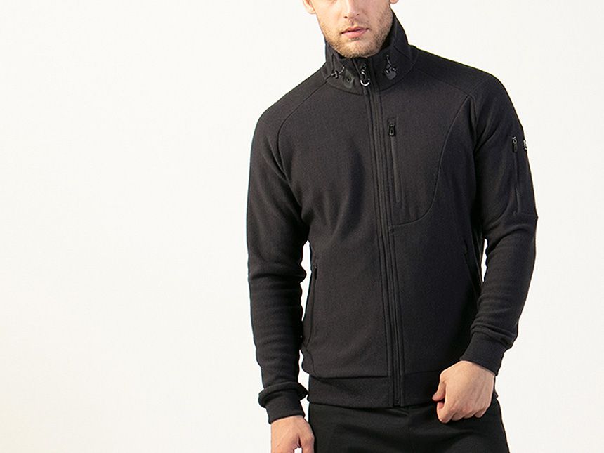 吸湿 速乾性 防臭 抗菌 ストリングスで調整可能な長めのスタンドカラー左袖のジッパーポケット内側のロゴテープ使いがおしゃれリブ袖口 ジェットブラックメランジ定番のブラック。
